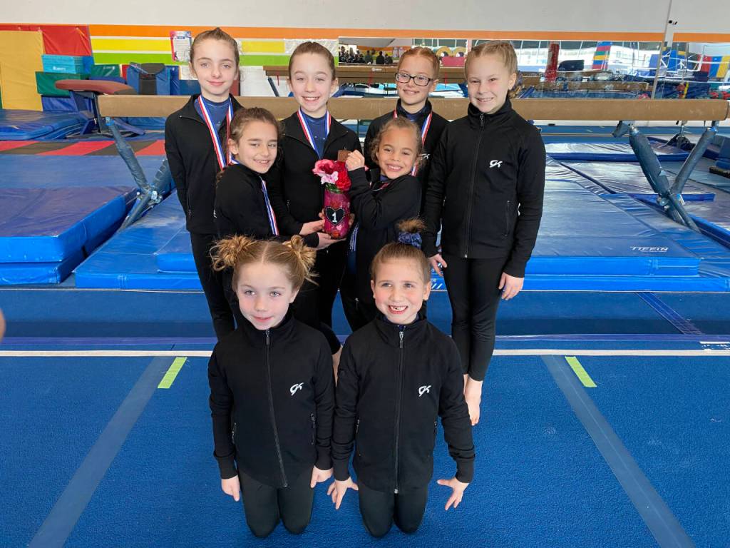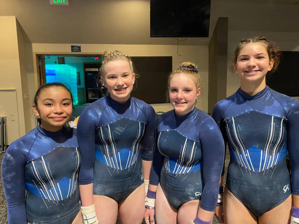 On the first day of competition, the Platinum Team of Kira Hartman, Lucy Spelker, Mariah Traband and Scarlett Sullivan each advanced to the Region 2 Championships in Everett in April. To qualify for the six-state regional, gymnasts needed to attain a minimum score of 35.00 at their respective state meets. Spelker, competing in the Junior D age group, earned a fifth place medal on FX (9.425). Traband in the Child A age group, took second on the beam (9.175). Sullivan in the Child D age group, placed seventh on the floor exercise, and Hartman scored a 9.025 on the floor in the Child C division.