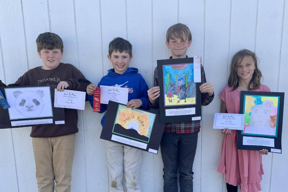 Artists in Olympic Christian School’s fifth-grade division include award-winners, from left, Bodey Wood, Noah Kiser, Ben Lovell and Sami Whitmore.