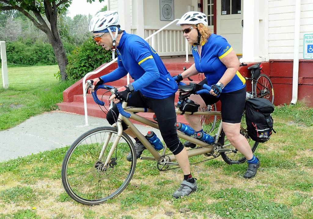 David Nestvold of Bellevue, front, and Kary York of Kirkland prepare to leave the Dungeness Schoolhouse north of Sequim during Saturday’s Northwest Tandem Rally bicycle event.