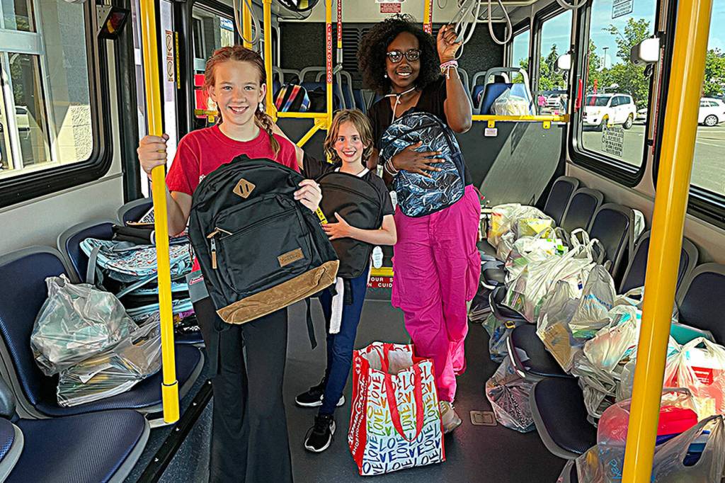 Boys & Girls Club of the Olympic Peninsula club members and staff worked alongside Rotarians to hand out school supply lists and bags last Friday so customers could purchase items for the fair. Supplies were placed on a Clallam Transit bus.