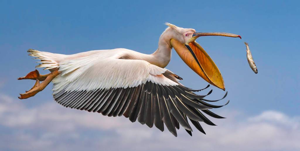 Fryxell’s photo, “Catch of the Day,” captured the Great White Pelican (African Pelican), the second largest species of pelican and one of the largest flying birds in the world, standing up to 5 feet high with a wingspan of up to 11 feet. This particular bird was photographed off the coast of Walvis Bay, Namibia flying with its beak open and gular pouch extended to catch a fish in mid-air.