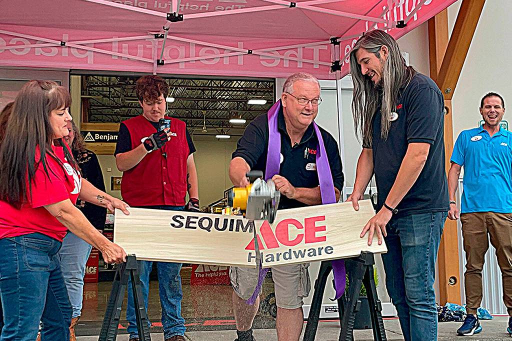 Store manager Bill McClansburgh cut the chamber’s ribbon and sawed an “Ace Hardware” sign on Aug. 31 to commemorate the new store at 232 Valley Center Place in Carlsborg.