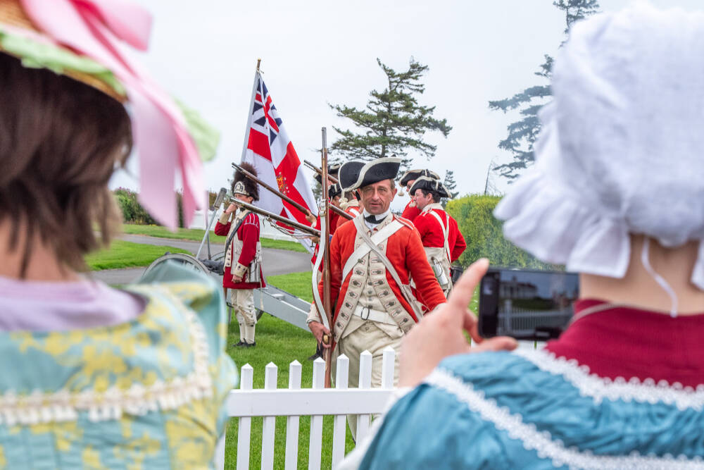 Spectators in period costumes watch and document a demonstration of Revolutionary War era British artillery technique at the Northwest Colonial Festival this past weekend, highlighting the juxtaposition between the modern and historical that can be seen throughout the festival.