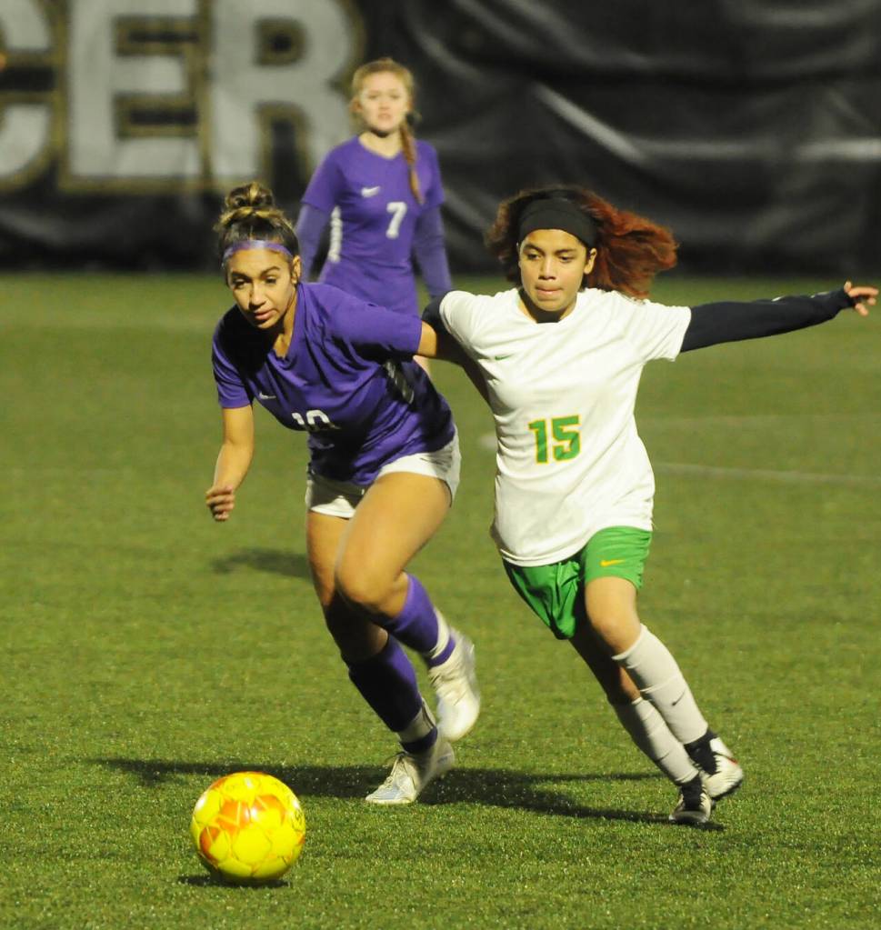 Sequim Gazette file photo by Michael Dashiell / Sequim’s Jennyfer Gomez, left, battles with a Clover Park midfielder in the Wolves’ 2-0 win in the West Central District tourney opener in 2022.