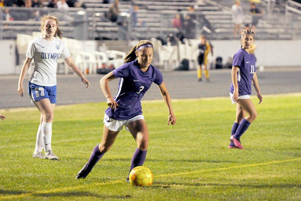 Sequim's Taryn Johnson dribbles toward the goal during a win over Olympic.