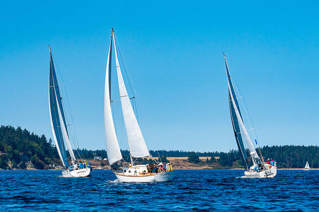 Photo by Fran Reisner Thompson / From left, Denali (skippered by Bob BacCauley), Pinafore (skippered by Bernie Armstrong) and Sirius (skippered by Durkee Richards) compete in the Reach and Row for Hospice on Sequim Bay in 2022.