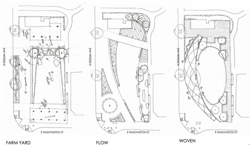 JETT’s first concept, “Farmyard,” offers a rain garden along the west side of the lot, a lawn in the middle, a porch and swings along East Washington Street, a seat-wall along the lawn, an interactive storm(water) feature, and covered enclosures north of the property for sitting and eating.
