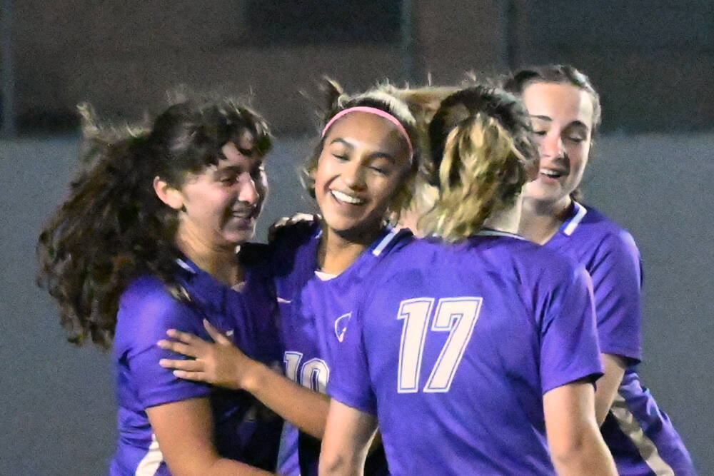 Sequim’s Jenny Gomez and Taryn Johnson each notched braces against Kingston and their Central Washington-commit goalkeeper Leighton Menge in a 4-0 Wolves win on Oct. 3.