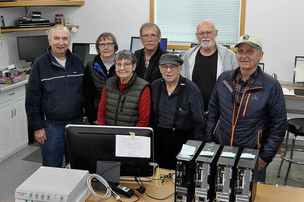 Some of the dedicated volunteers with the Sequim PC Users Group include, from left, Bob Smith, Kelly McKillip, Maggie Walthall, Mike Sanborn, Jason Cooper, Tom LaMure, and Joe Mirabella. The group has refurbished 1,200 computers in LaMure’s garage in 12 years and with him planning to move they’re seeking a new space to store and refurbish laptops going forward.