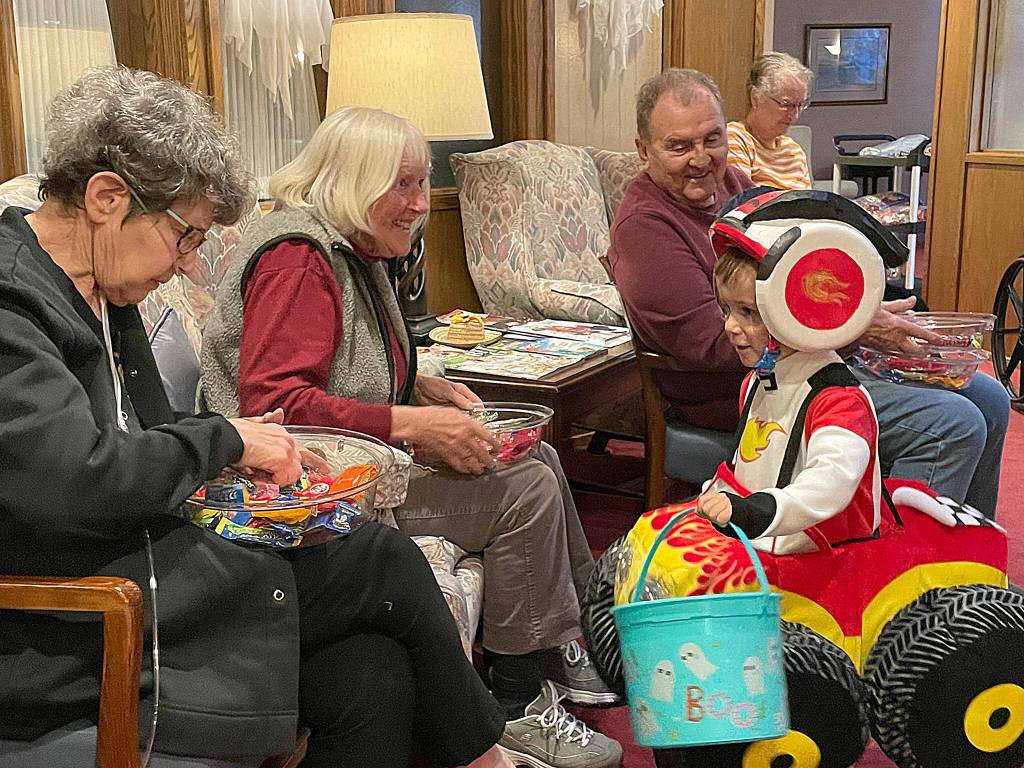 Dressed as AJ and Blaze from “Blaze and the Monster Machines” television show, Hunter Bushman, 3-and-a-half, trick-or-treats inside the Fifth Avenue on Halloween and receives candy from Carol Mcrae, Rosemary Freed and Norm Chojnicki.