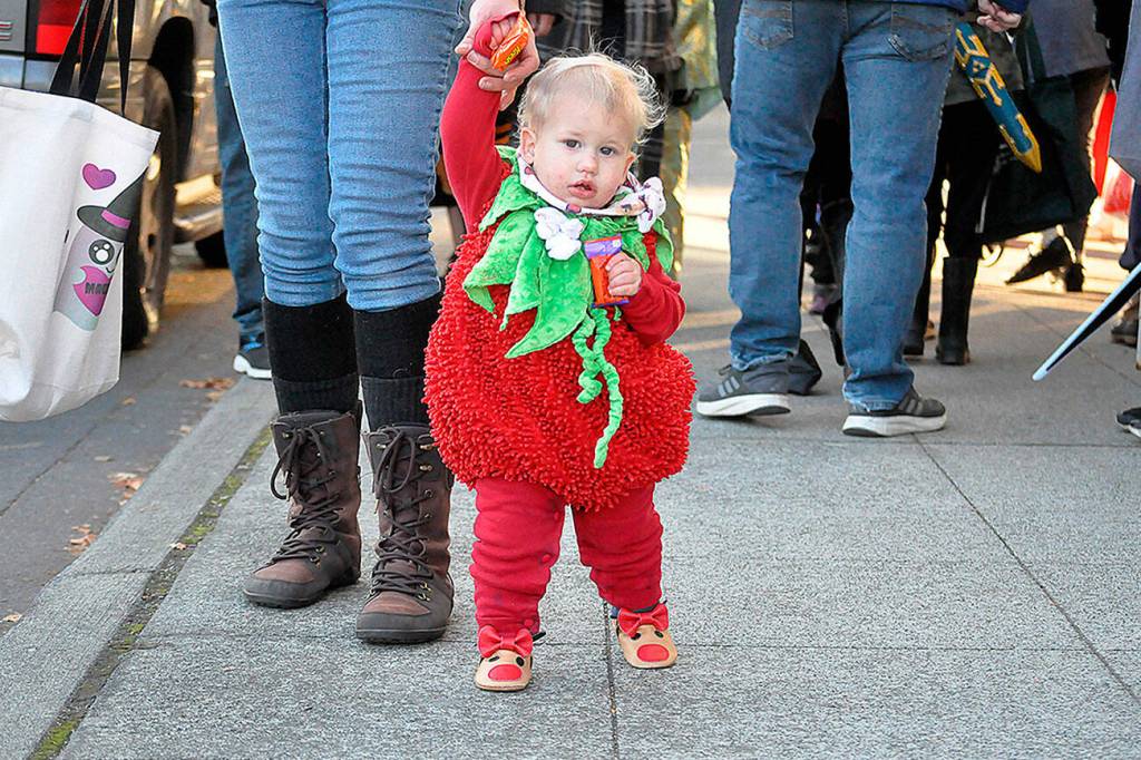 Thirteen-month-old Maggie Bagley trick-or-treats in downtown Sequim on Halloween with her mom and two older brothers.