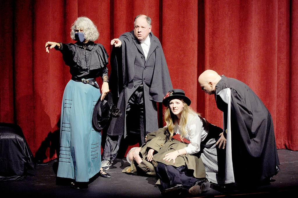 William Gillette (portrayed by Joel Hoffman, fourth from left) finds a note that reveals that a stage doorman where he and fellow thespians work has just been murdered — suggesting the killer is most likely one of the guests he’s hosting. Looking on are, from left, Madge Geisel (Cheryl Tamblyn), Felix Geisel (Steve Rodeman), Aggie Wheeler (Merrin Packer), Simon Bright (Stephan Willms) and Martha Gillette (Cheryl DiPietro).