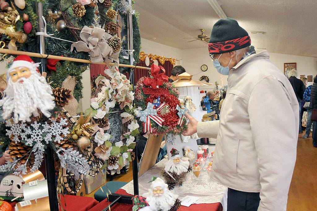 Arthur Seward of Sequim examines a display of handmade wreaths created by Sequim-based The Hitching Post during the Holiday Craft Fair at the Sequim Prairie Grange near Carlsborg on Dec. 2. The fair featured a variety of holiday-themed crafts and gifts made by local artisans, as well as lunch prepared by grange members.
