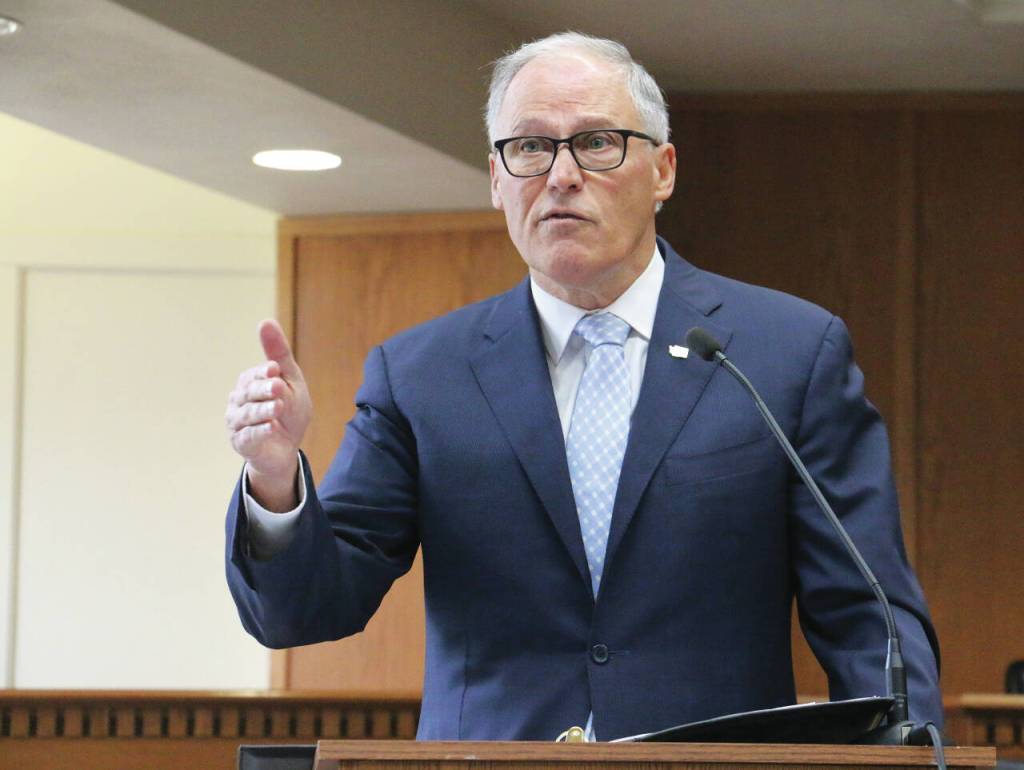 Photo courtesy of Washington State Journal /Gov. Jay Inslee addresses reporters before the start of this year’s Legislative session.