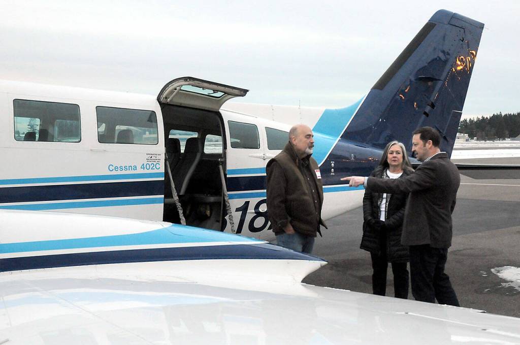 Clint Ostler, president of Dash Air Shuttle, right, points out features of the Cessna 402C aircraft to Peter Metz, left, and Kim Reynolds, both of Port Angeles, during an open house for the air service on Jan. 16 at William R. Fairchild International Airport in Port Angeles.