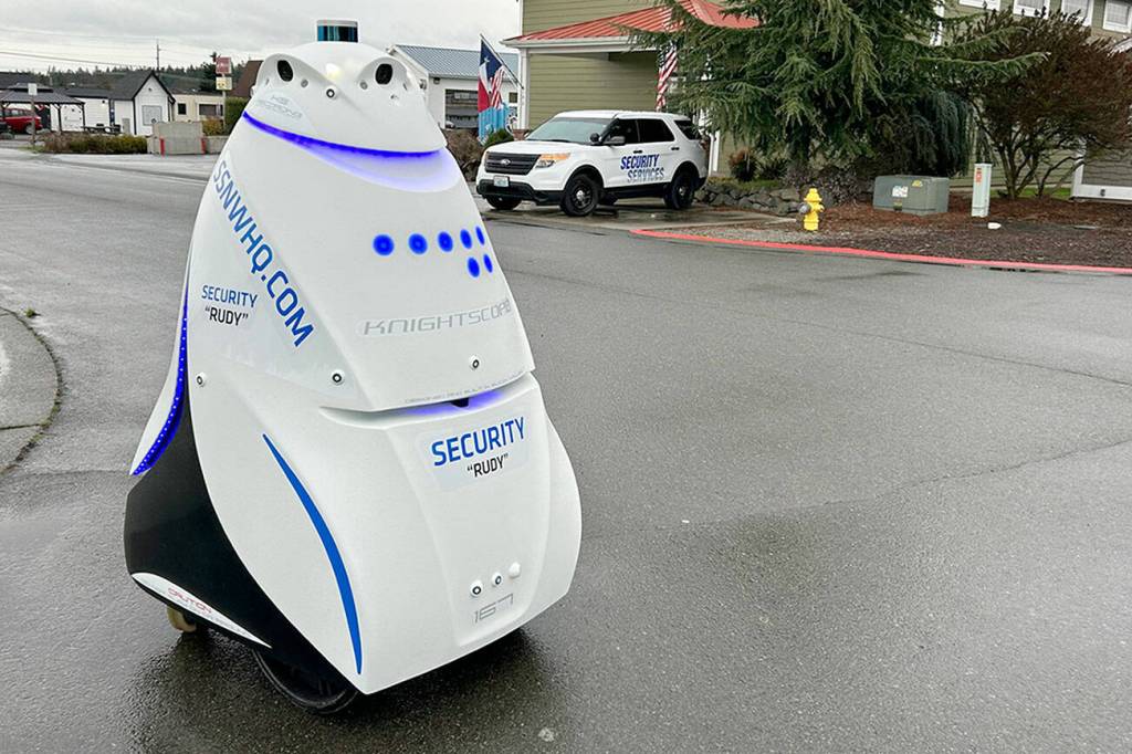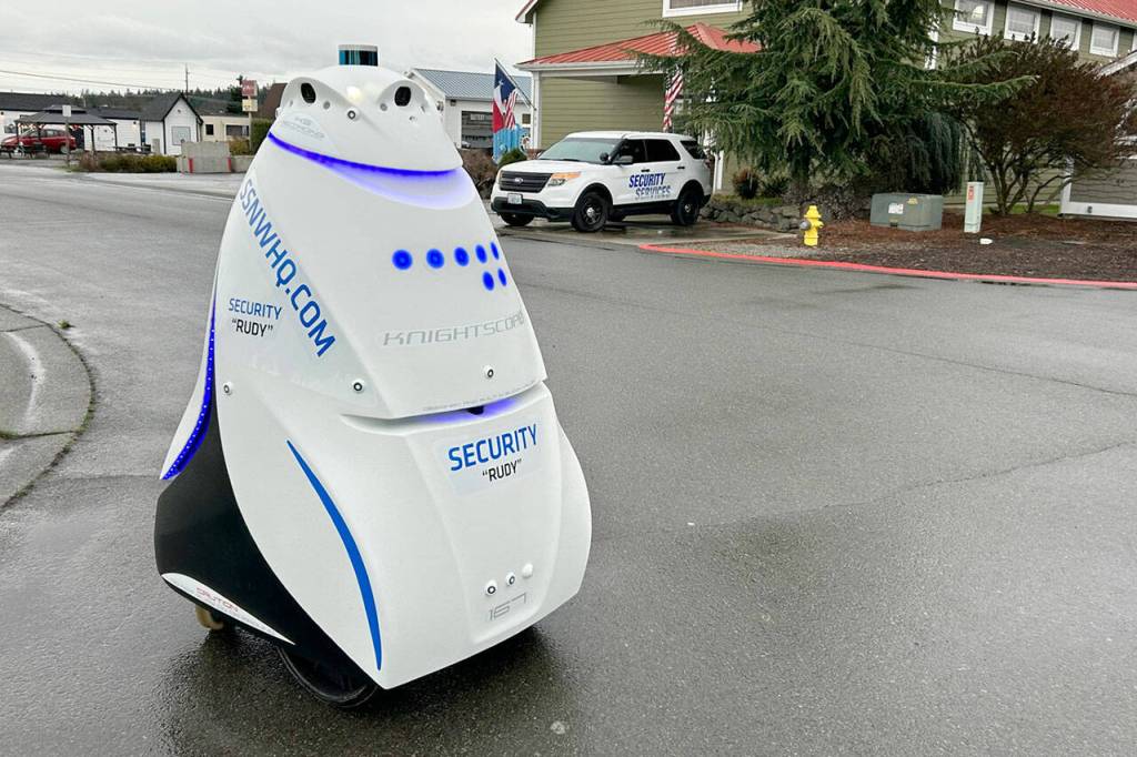 Joe D’Amico, president of Security Services Northwest Inc., said he’s been looking into what the robot can do for about a year and it’s been on patrol two weeks in Sequim going around the business block of Center Park Way.