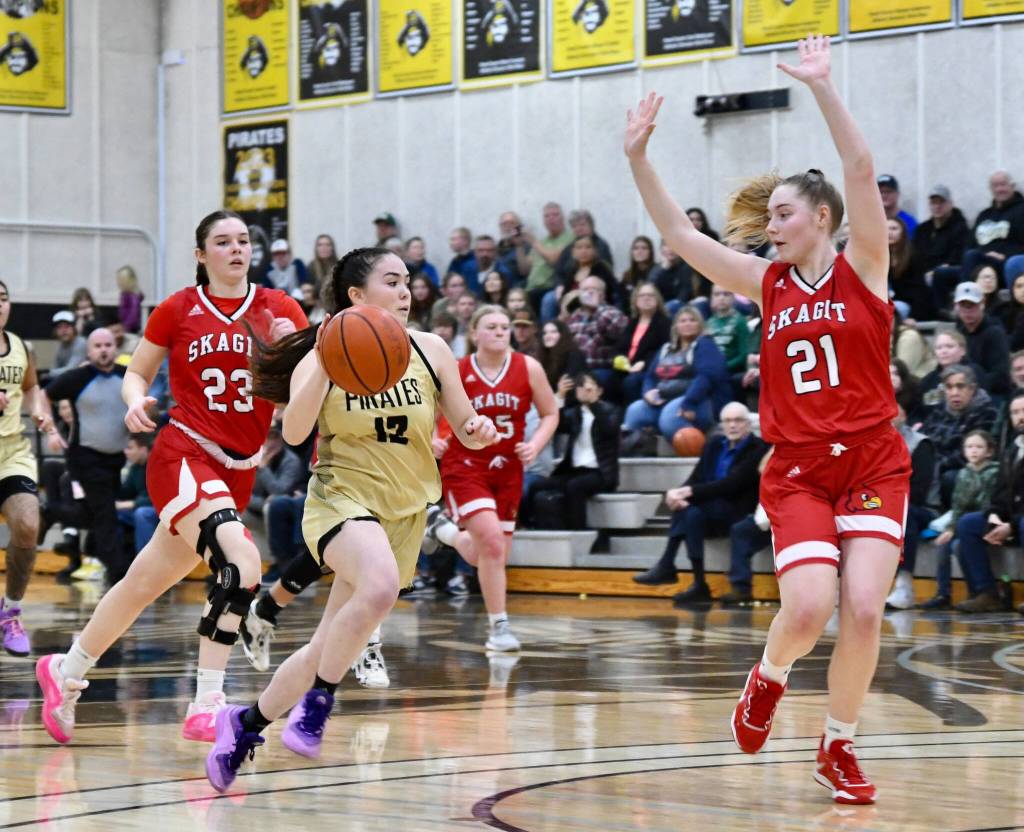 Photo by Jay Cline/Peninsula College / Peninsula College guard Hannah Bates looks for an open teammate in the Pirates’ 60-57 win over Skagit Valley on Feb. 21.