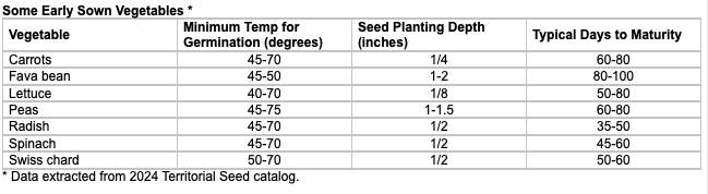 As you search through seed catalogs, keep two considerations in mind for early direct-sown vegetables. Firstly, try to find seeds with the shortest growing season or days to maturity. This is critical if you will want them mature and harvested to the timing of planting warm season vegetables in those locations.