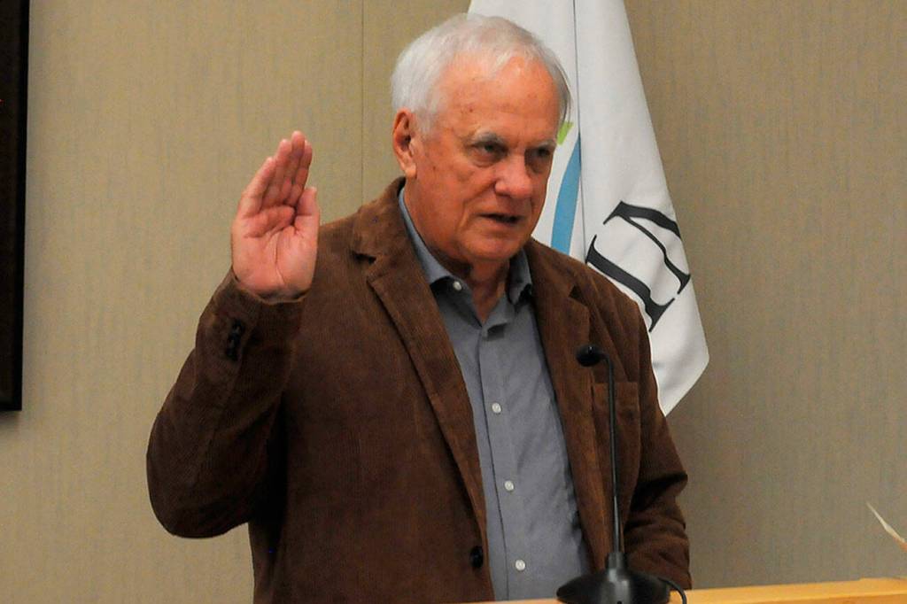 Tom Ferrell takes his oath office for Sequim city council seat on Jan. 8 in the council chambers. He announced plans to resign by March 31. City of Sequim staff plan to open applications starting March 11 for two weeks.