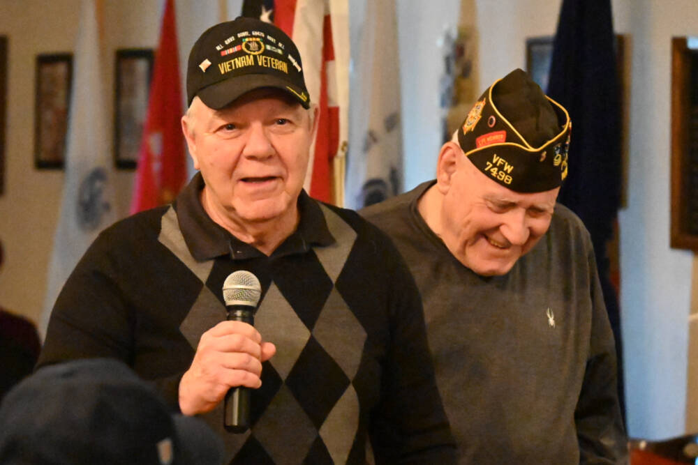 Those gathered in the VFW hall also got a rousing version of the sea shanty “Bell Bottom Trousers” from Richard Hazelton, a 99-year-old World War II U.S. Navy veteran who served aboard the USS Yorktown.