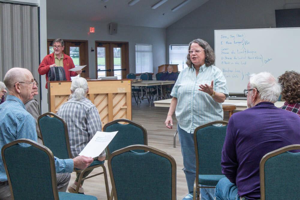 Photo by Emily Matthiessen / Joan Reeve Owens, interim conductor with the Peninsula Singers, helps lead a rehearsal in early April. The group hosts their spring concert on Sunday, April 28, at Trinity United Methodist Church.