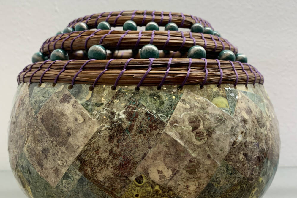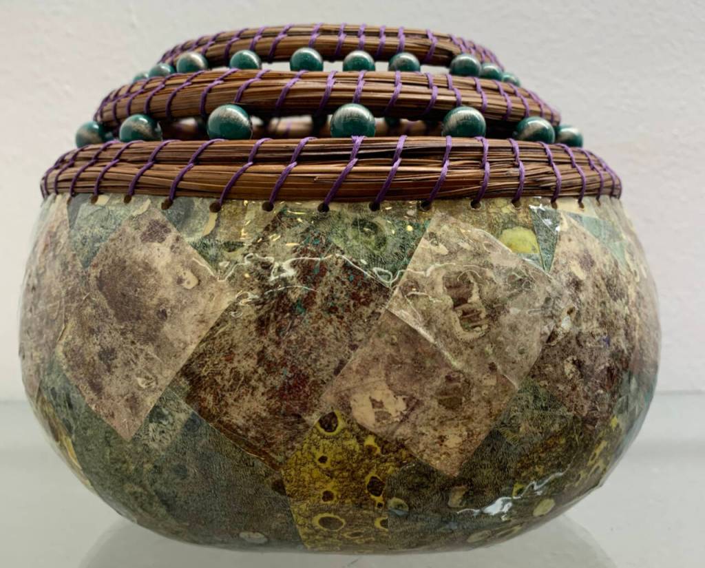 Smith’s principle art form is gourds. She carves, paints, wood-burns but her favorite is a pine needle coiled gourd with beading using altered paper as the background. She will demonstrate how she alters paper, dries, cuts it into pieces and then decoupages the results on to a gourd.