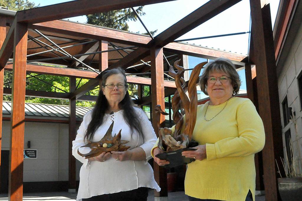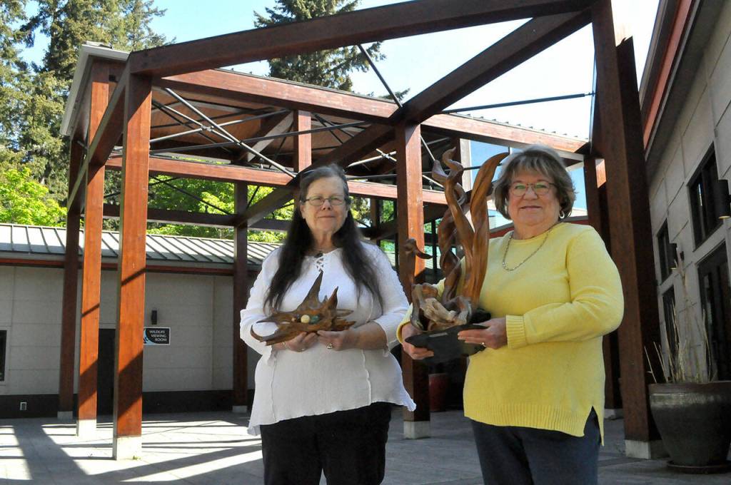 Olympic Driftwood Sculptors, Kathy Bachman, club president, on left and instructor Tuttie Peetz hold two pieces “Dragon’s Flame” and “Undulating Kelp” that will be on display at the club’s annual art show May 18-19 in the Dungeness River Nature Center.