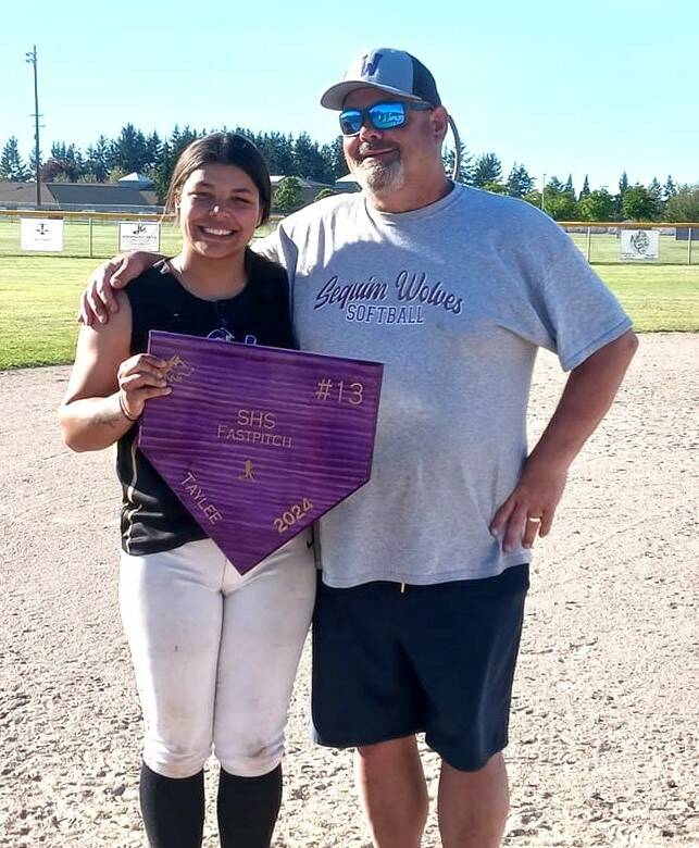 Sequim senior Taylee Rome is honored after Friday’s game against Port Angeles, along with her coach Mike McFarlen. Rome finished the season with a .644 batting average.