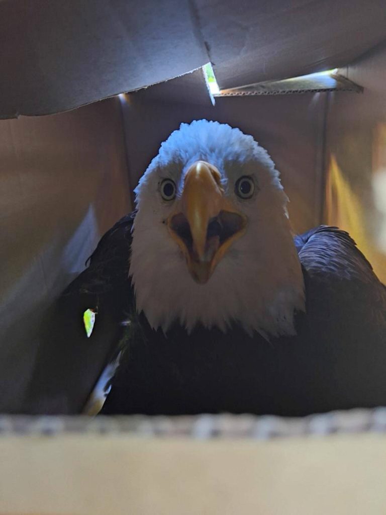 There were a lot of struggles to get the eagle in the box, she said, as he’d try to nip at them and his wings or talons would pop out of the box.
