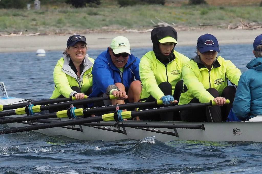 Taking first place in the Open Water Coxed Quad class were a quintet from the Sequim Bay Yacht Club. Rowers Frank DeSalvo, Amy Holms, Christi Jolly and Jeanne Neal, and cox Carolyn DeSalvo clocked in the 7.8-mile course in 1:10:20.3 for first place.