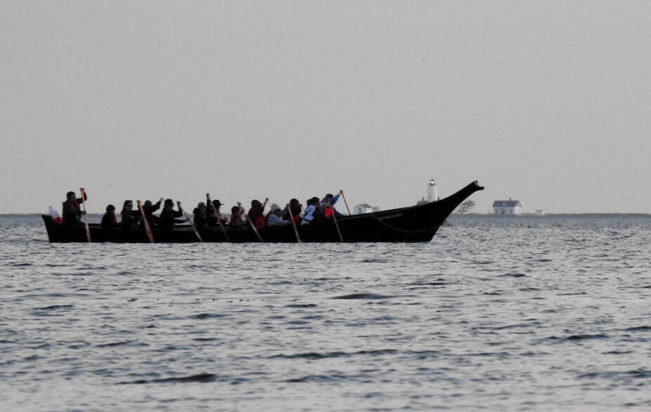 Photo by Teresa Herrera / A canoe team on the Power Paddle to Puyallup Youth Canoe Journey 2024 passes near the New Dungeness Light Station soon after launching from area to Port Townsend on July 26.