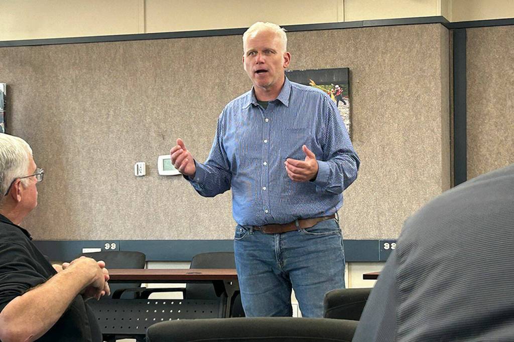 Sequim Gazette photo by Matthew Nash/ Kevin Van De Wege, a candidate for the Commissioner for Public Lands, speaks at a forum on July 25 for the Olympic Peninsula Fire Commissioners Association in Carlsborg.