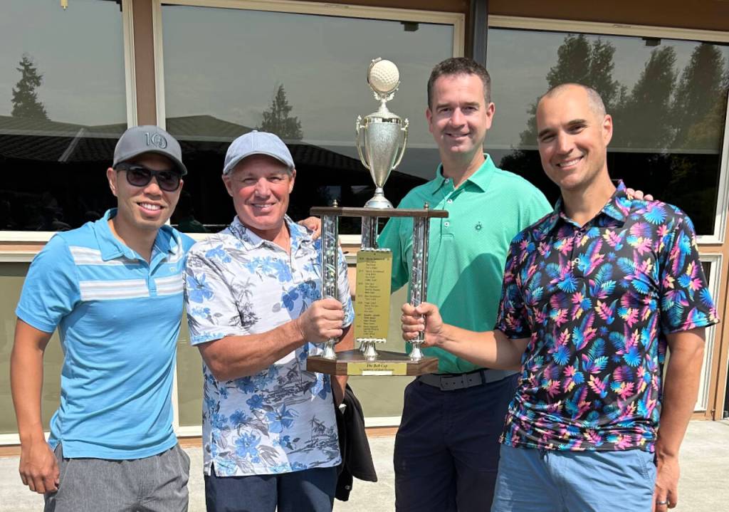 Photo courtesy of Mary Jane Duncan / Big winners from this year’s annual Bob Cup are a quartet of golfers from Olympia and dozens of athletes here on the Olympic Peninsula. Linc Beppu, Tom Henshaw, Doug Kramer and Douglas Kramer topped the field at the ninth-annual Bob Cup golf tournament at The Cedars at Dungeness on July 27, a tournament that benefits Special Olympics athletes on the Olympic Peninsula. Mary Jane Duncan created the tournament in memory of her late husband, longtime Sequim resident Bob Duncan. Funds raised from the event go to various expenses, from uniforms and equipment to transportation. There are also venue practice fees, though organizers note most places on the Olympic Peninsula allow the Orcas to hone their skills for free.