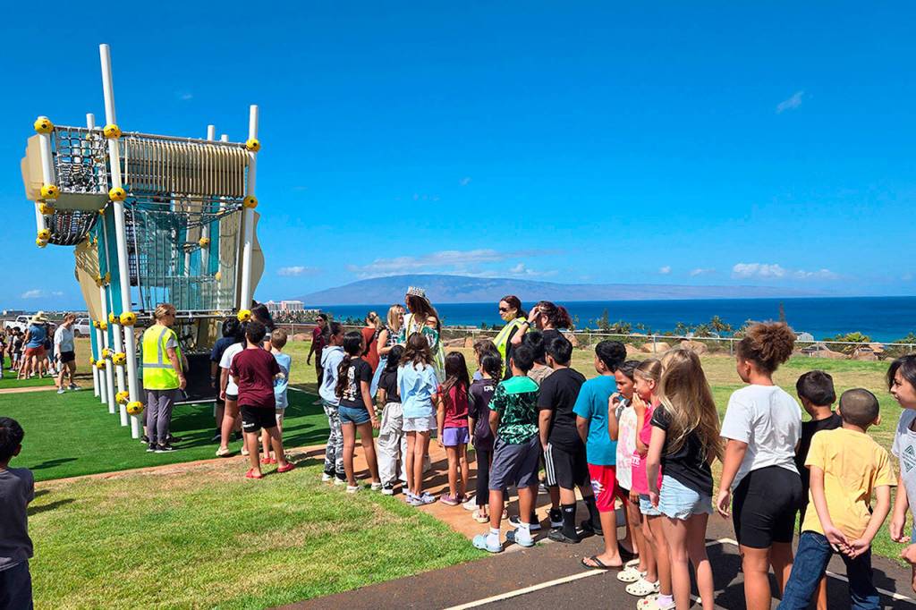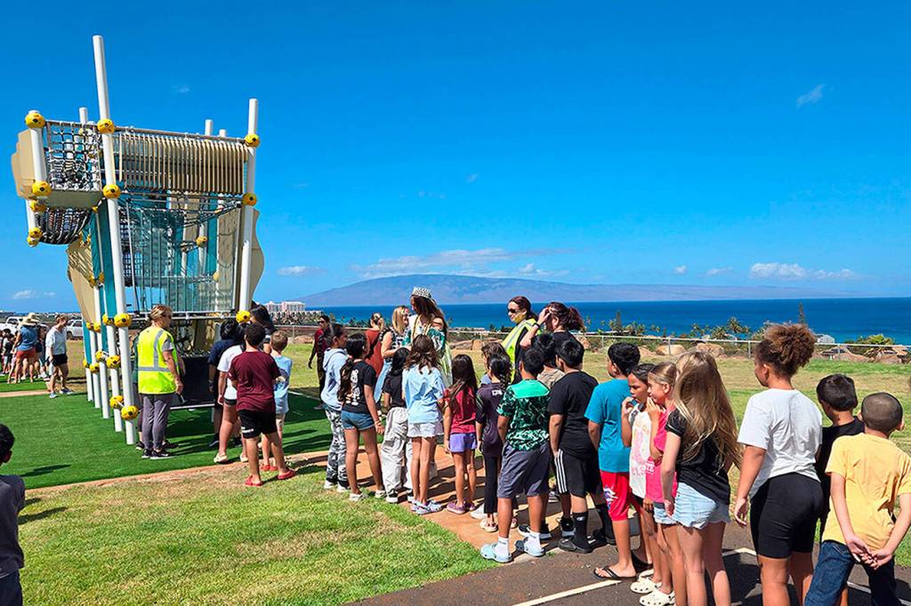 Elementary school students who lost their school to a wildfire last year on Maui recently celebrated the opening of a new playground set, thanks in part to a Sequim resident.