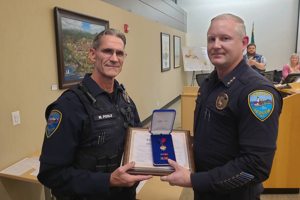 Sequim Deputy Mayor Rachel Anderson read a proclamation and with Police Chief Mike Hill honored Poole with the award and a plaque at the Oct. 14 city council meeting.