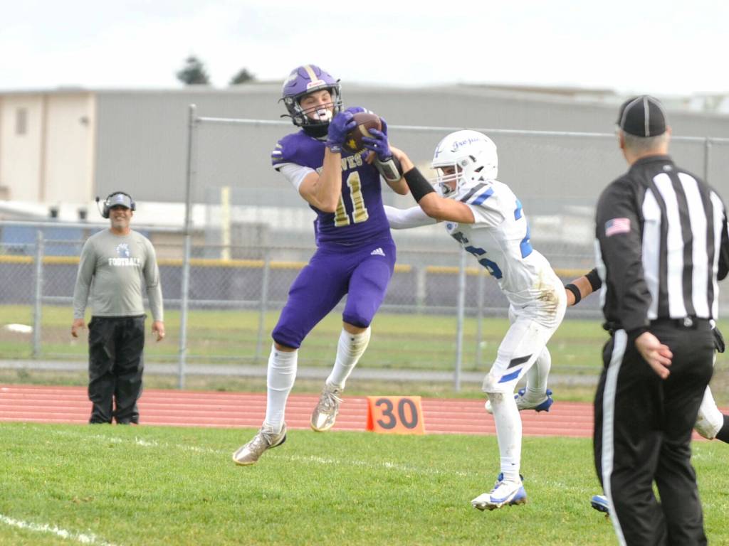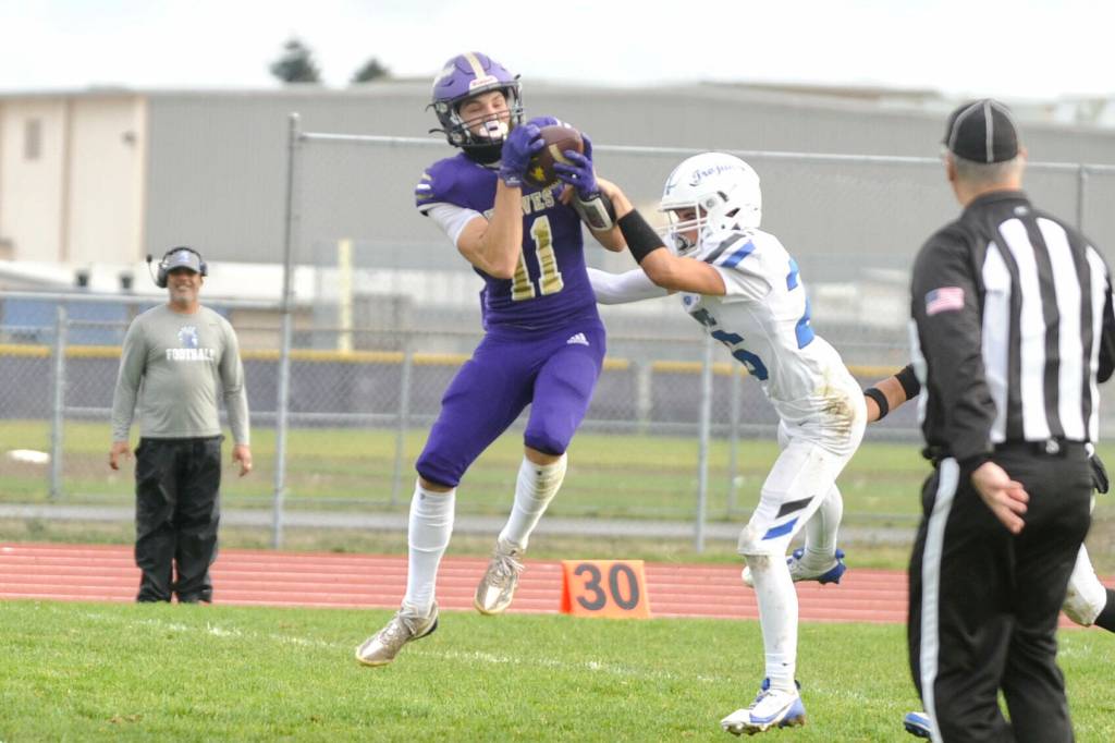 Sequim’s Charlie Grider makes a catch for a first down against Olympic on Oct. 19.