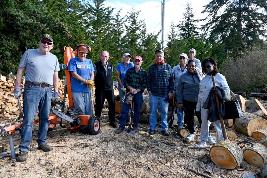The men gather at a locale on Monday mornings, most recently on Tatom’s property, and other days as necessary, to split the wood with axes, chainsaws or a wood splitter. Most donations come from Sequim-based Town & Country Tree Experts.