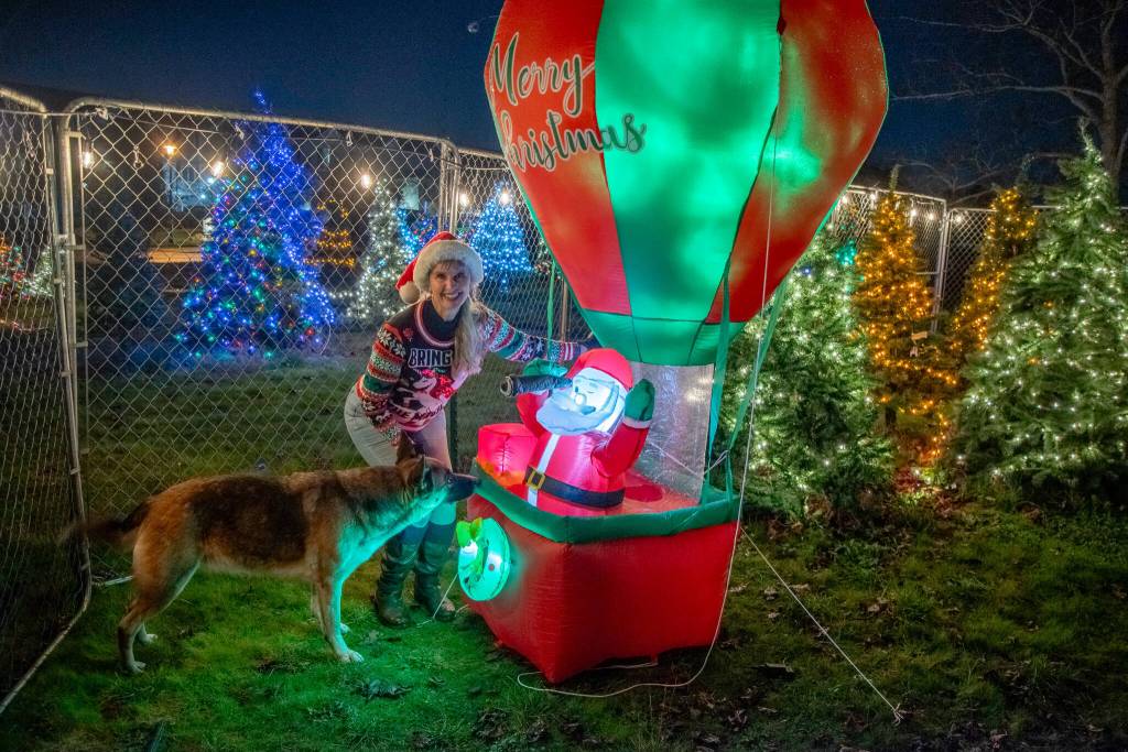 Sequim Gazette photo by Emily Matthiessen/ Hot air balloon pilot Captain Crystal Stout poses while her dog Lucy examines a blow-up statue while artificial trees glow in the background of her yard art project.