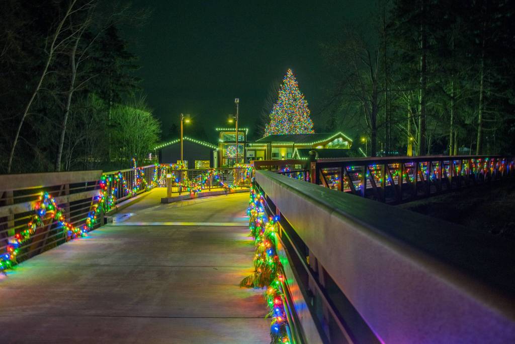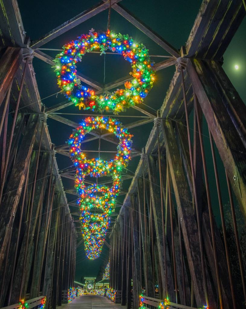 Sequim Gazette photo by Emily Matthiessen How many lights would you say are on this 90-foot tree? Spoiler alert: a lot! Staff at the Dungeness River Nature Center held a contest on social media asking just that and they revealed on Dec. 20 there are 11,684 lights! They awarded a gift card for a guess of 12,000. The lights will be up in Railroad Bridge Park at 1943 W. Hendrickson Road in Sequim through the end of December. Jamestown S’Klallam Tribe contracts P. Walker Inc. to place more than three million lights at its businesses and campuses each year. See more photos of the bridge and center’s lights at the Gazette’s website.