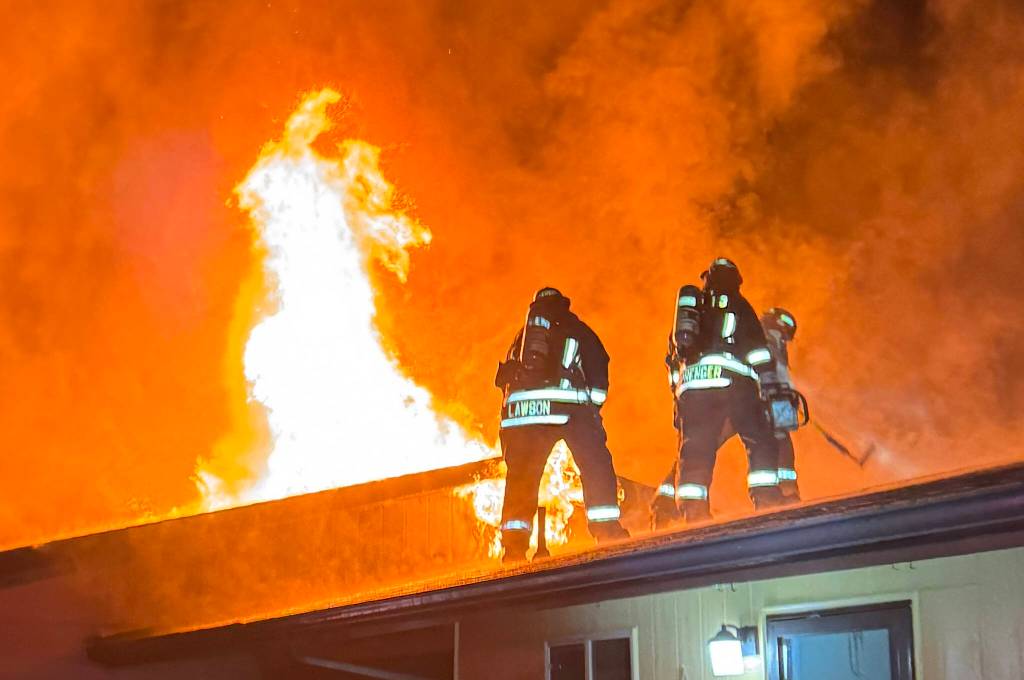 Firefighters with Clallam County Fire District 3 determine a course of action last year on March 21 at a garage/house fire to prevent flames going from the attic into the remainder of the home. Calls to 911 for fires were down in 2024.