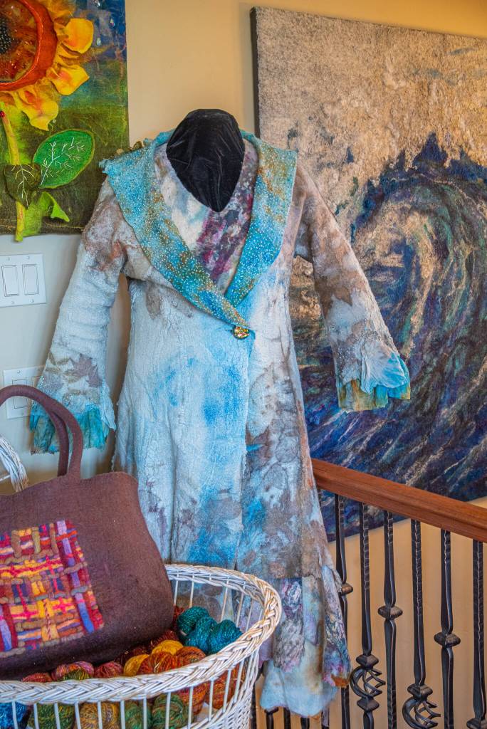 She credits Su Nylander for getting her into dying fabrics and fiber, spinning and weaving and for encouraging her to take her first felting class.