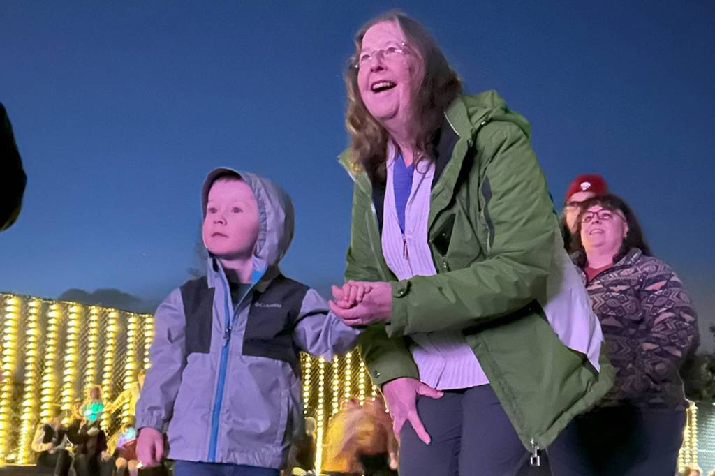 Brody Babcock, 3, and his grandma Terri Hauff of Port Angeles enjoy the start of the Illuminated Drone Show on Saturday night. For more photos from the sixth annual Sunshine Festival, see page B1.