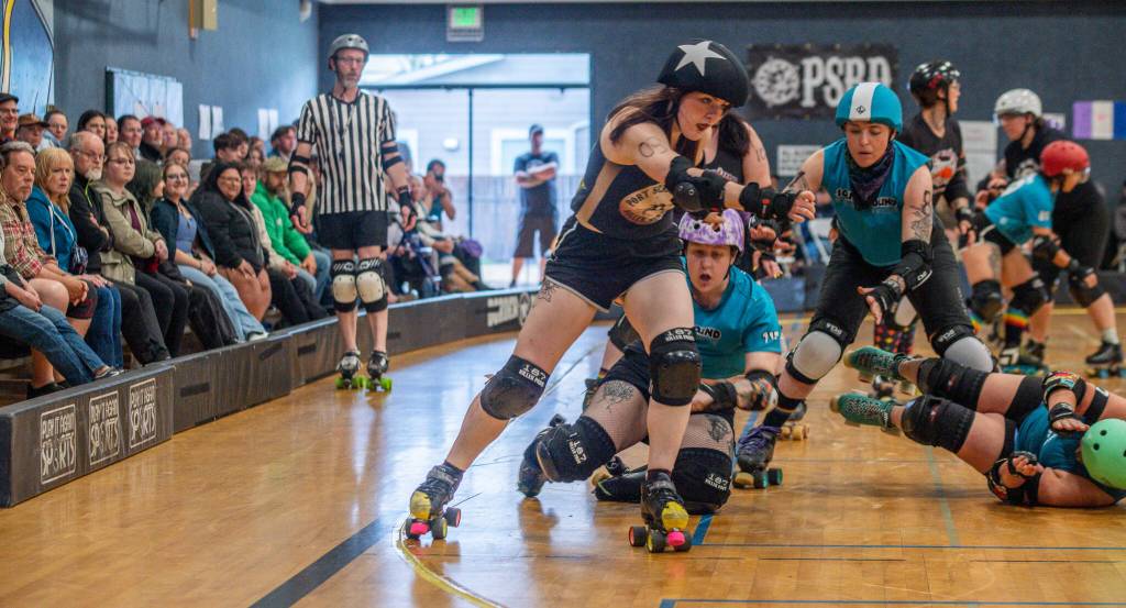 Port Scandalous Roller Derby team the Scandals’ Olivia Wray, aka “Small Fry,” was bestowed with the MVP Jammer title by the opposing team, Olympia’s South Sound Roller Derby, after a high-adrenaline bout at the Boys and Girls Club of Sequim on Saturday evening. Wray (in the helmet bearing a star) suffered a minor injury or two but kept going.