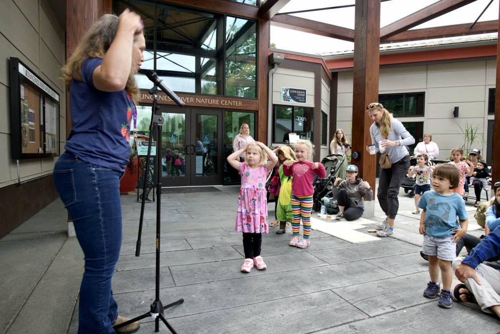 Jennifer Lu’Becke with North Olympic Library System (NOLS) leads Nature Storytime outdoors at the Dungeness River Nature Center in Sequim on Tuesday, Aug. 5. The program entertained tykes with nature-related stories, songs and rhymes.