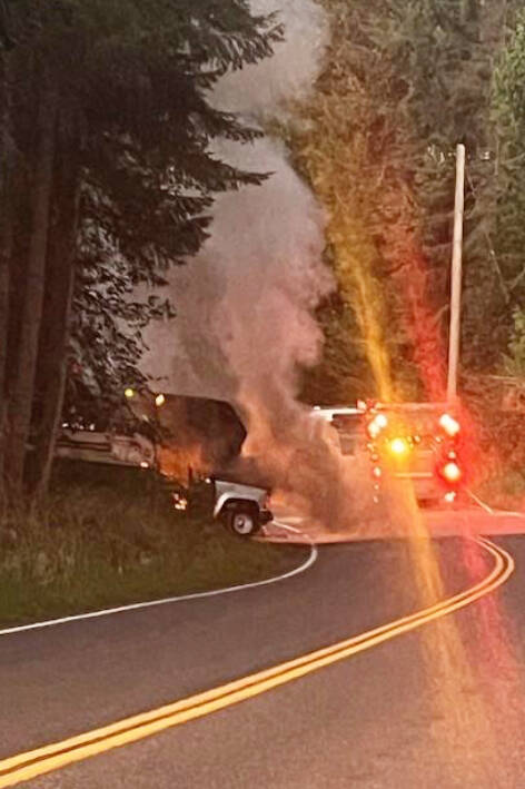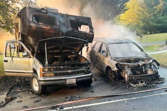 Photos courtesy Chris Turner, Clallam County Fire District 3/ A vehicle fire early Sunday, Aug. 10 off Lost Mountain Road spread to a neighboring truck and RV, according to firefighters with Clallam County Fire District 3.