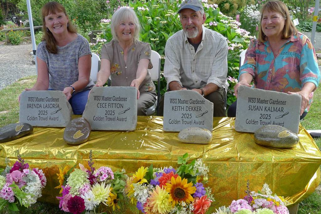 Master Gardeners Brenda Lasorsa, Cece Fitton, Keith Dekker, and Susan Kalmar were recently honored with the Golden Trowel Award during a gathering at Woodcock Demonstration Garden in Sequim.