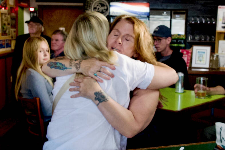 Cheryl Hales gives Jennifer Hanshaw a hug during a fundraiser at Rainshadow Cafe to help pay medical expenses for Hanshaw’s daughter, Ember.