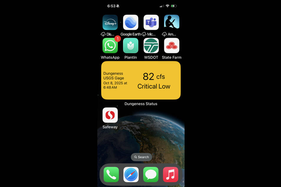 The app and associated widget will display the current streamflow (represented as cubic feet of water flowing per second) in the Dungeness River against a background color with a description of current conditions. An associated web page provides further detail as well as a color-coded chart of the flow ranges and associated actions recommended for people interacting with irrigation water or the river itself.