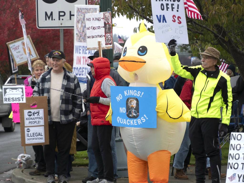 Demonstrators lined Washington Street near Priest Road to peacefully declare that America has no kings, and that power belongs to the people. A similar protest took place outside the county courthouse in Port Angeles.