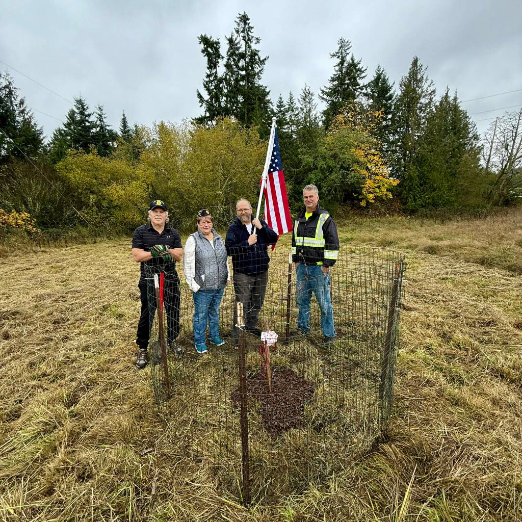 Standing about 4 feet tall, the resilient clone was gifted to Sequim VFW Post #4760 in May and was planted on Thursday, Oct. 30 at the 45-acre memorial park. Those present for the ceremonial planting included Nancy Zimmerman, chaplain, Michael Trebert DAR and commander, American Legion Post #62; Kevin O’Neill, commander, Sequim VFW Post #4760; John Kowalski, senior vice president, Sequim VFW; and Gary Butler of the city’s Parks Department.